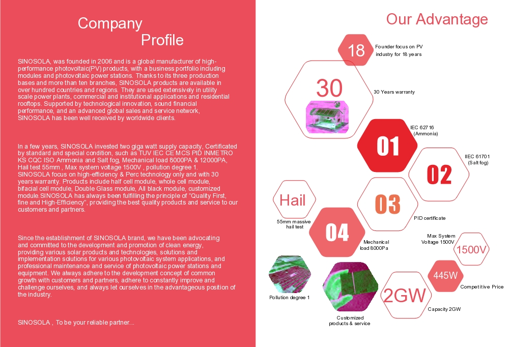 In a few years, we invested two giga watt supply capacity, Certificated by standard and special condition, such as TUV IEC CE MCS PID INMETRO KS CQC ISO Ammonia and Salt fog, Mechanical load 8000PA & 12000PA, Hail test 55mm , Max system voltage 1500V , pollution degree 1. we focus on high-efficiency & Perc technology only and with 30 years warranty. Products include half cell module, whole cell module, bifacial cell module, Double Glass module, All black module, customized module.
